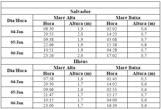 Entre os dias 04/01 (sexta-feira) e 06/01 (domingo), a maré deverá atingir sua altura máxima em torno das 9h e das 21h, com valores variando de 1,6 a 2 metros. Já a altura mínima da maré deverá variar de 0,5 a 0,8 metro por volta das 3h e das 15h. As ondas deverão ter agitação fraca, com altura máxima podendo chegar a 1,5 metro.