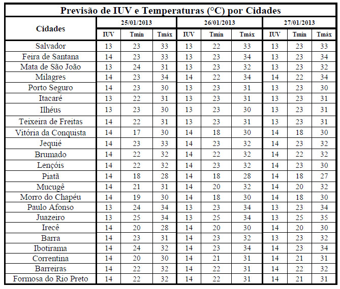 Os Índices de Radiação Ultravioleta (IUV’s) previstos para o período de 25 à 27 deverão variar de 13 a 14, que segundo a Organização Mundial de Saúde (OMS) fazem parte da categoria “Extrema”. Com isso, cuidados como evitar exposição prolongada à radiação solar, principalmente nos horários das 10 às 16 horas, o uso de protetor/filtro solar, chapéus, bonés, óculos escuros e roupas leves são essenciais para minimizar danos à saúde, sobretudo a pele e aos olhos.