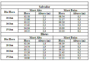 Entre a sexta-feira (25) e o domingo (07) a maré deverá atingir sua altura máxima em torno das 03h00min e das 15h00min, com valores variando de 1,8 a 2,4 metros. Já as alturas mínimas deverão ocorrer em torno das 09h00min e das 21h00min, com valores variando de 0,1 a 0,5 metro. As ondas deverão ter agitação fraca, com altura máxima podendo chegar a 1,5 metros.