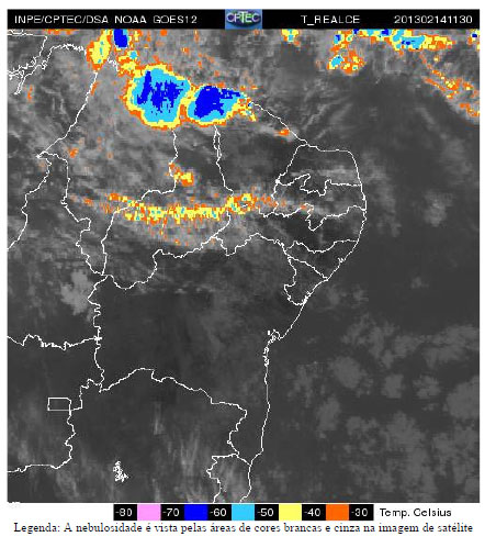 Para o período entre os dias 15 e 17/02/2013, as condições do tempo na Bahia continuam sendo influenciadas por uma massa de ar quente e seco, que mesmo perdendo força continua reduzindo a nebulosidade e as chuvas na maior parte do Estado. Ainda assim, o calor associado à umidade e as temperaturas elevadas deverá contribuir para a ocorrência de chuvas fracas e isoladas nas regiões Oeste, São Francisco e Sudoeste, podendo ocorrer com mais frequencia no final da tarde e durante a noite, enquanto que, para as regiões do Recôncavo e Sul, é a umidade que vem do Oceano Atlântico que deverá contribuir para a ocorrência dessas chuvas.