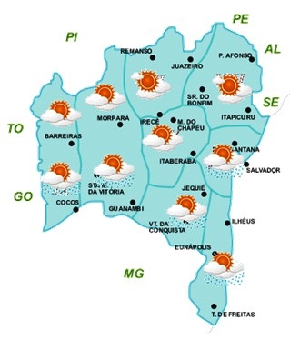 Por outro lado, nas regiões Norte, Nordeste e Chapada Diamantina é a massa de ar quente e seco que deverá manter o céu ensolarado e com poucas chances de ocorrer chuvas. Além de reduzir a nebulosidade, a permanência dessa massa de ar também está deixando as temperaturas elevadas em todo o Estado, onde as máximas previstas para este final de semana deverão variar entre32°C e 36°C. Ainda assim, temperaturas mais amenas também são esperadas para algumas regiões do Estado, a exemplo das áreas serranas da Chapada Diamantina e Sudoeste, onde as mínimas poderão chegar aos18°C.
