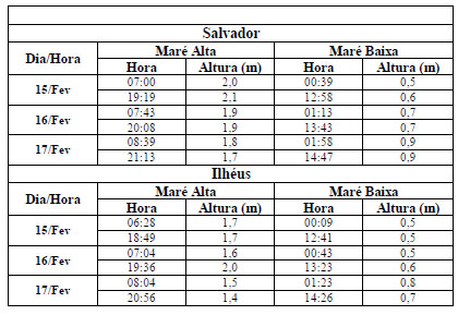 Entre os dias 15 e 17 de Fevereiro, a maré deverá atingir sua altura máxima em torno das 08h e das 20h com valores variando de 1,4 a 2,1 metros. Já as alturas mínimas deverão ocorrer em torno das 02h e das 14h com valores variando de 0,5 a 0,9 metro. As ondas deverão ter agitação fraca, com altura máxima podendo chegar a 1,0 metro.