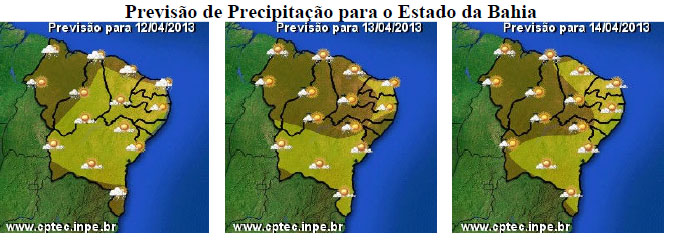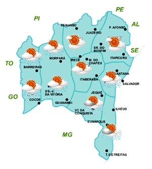 As condições do tempo na Bahia durante este final de semana não deverão ter mudanças significativas em relação ao que vem sendo observado. Isso se deve a atuação da massa de ar quente e seco sobre o Nordeste brasileiro, que vem inibindo a formação de nuvens de chuvas sobre os estados do Rio Grande do Norte, Paraíba, Pernambuco, Alagoas, Sergipe e centro-norte da Bahia. Com isso, para esta área da Bahia, que abrange as regiões Norte, Nordeste e Chapada Diamantina, a previsão é de céu parcialmente nublado a claro e com pouca possibilidade de chuva.