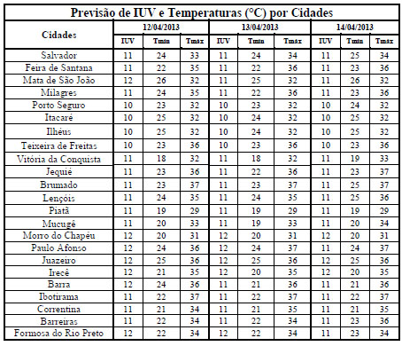 Os Índices de Radiação Ultravioleta (IUV’s) previstos para o período de 12 a 14 deverão variar de 10 a 12, que segundo a Organização Mundial de Saúde (OMS) fazem parte das categorias “Muito Alta e Extrema”. Com isso, os cuidados deverão ser mantidos quanto à exposição prolongada à radiação solar, principalmente, entre as 10 às 16 horas. Para isso, recomenda-se a utilização de protetor/filtro solar, chapéus, bonés, óculos escuros e roupas leves, que podem minimizar os danos nocivos à saúde, sobretudo, a pele e aos olhos.