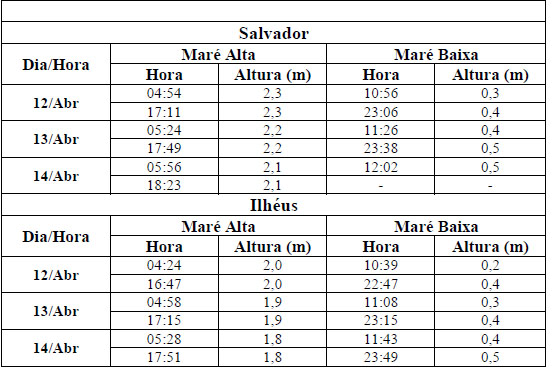 Entre os dias 12 (sexta-feira) e 14 (domingo) de abril, a maré deverá atingir sua altura máxima em torno de 05h00min e das 17h00min com valores variando de 1,8 a 2,3 metros. Já as alturas mínimas deverão ocorrer em torno das 11h00min e das 23h00min com valores variando de 0,2 a 0,5 metro. As ondas deverão ter agitação fraca, com altura máxima podendo chegar a 1,0 metros.