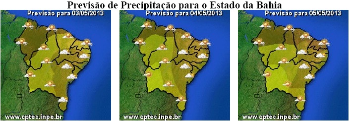 O ar seco e céu ensolarado é quem deve predominar nesse primeiro final de semana de maio na maior parte da Bahia. Isto se deve a atuação de uma massa de ar quente e seco que está atuando sobre as Regiões Sudeste, Centro-Oeste e parte do Nordeste brasileiro e, com isso, reduz a nebulosidade e as chuvas sobre essas Regiões.