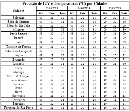 O outono marca o início da redução da radiação solar no Hemisfério Sul e, consequentemente, dos Índices de Radiação Ultravioleta (IUV's). Assim, para o período de 03/05 (sexta-feira) a 05/05 (domingo) os IUV's deverão variar de 08 a 10, que segundo a Organização Mundial de Saúde (OMS) fazem parte da categoria “Muito Alta”. Com isso, a OMS adverte quanto à exposição prolongada à radiação solar, principalmente, entre as 10 e as 16 horas, quando é aconselhado o uso de protetor/filtro solar, chapéu, boné, óculos escuros e roupas leves, evitando danos à saúde.