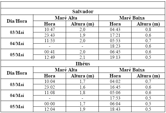 Entre os dias 03/05 (sexta-feira) e 05/05 (domingo), a maré deverá atingir sua altura máxima em torno de 11h30 e das 23h30, com valores variando de1,6 a2,1 metros. Já as alturas mínimas deverão ocorrer em torno das 05h30 e das 17h30, com valores variando de0,5 a0,8 metro. Os ventos fracos nesse final de semana também deverão influenciar na agitação das ondas, que deverão ter agitação fraca e a alturas máxima não deverá ultrapassar1,5 metro.