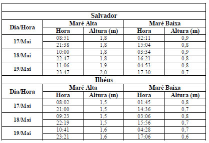 Entre os dias 17 (sexta-feira) e 19 (domingo) de maio, a maré deverá atingir sua altura máxima em torno de 10h30min e das 22h30min, com valores variando de 1,5 a 2,0 metros. Já as alturas mínimas deverão ocorrer em torno das 04h30min e das 16h30min, com valores variando de 0,6 a 0,9 metro. As ondas para este final de semana deverão ter agitação fraca e a altura máxima não deverá ultrapassar 1,5 metros.