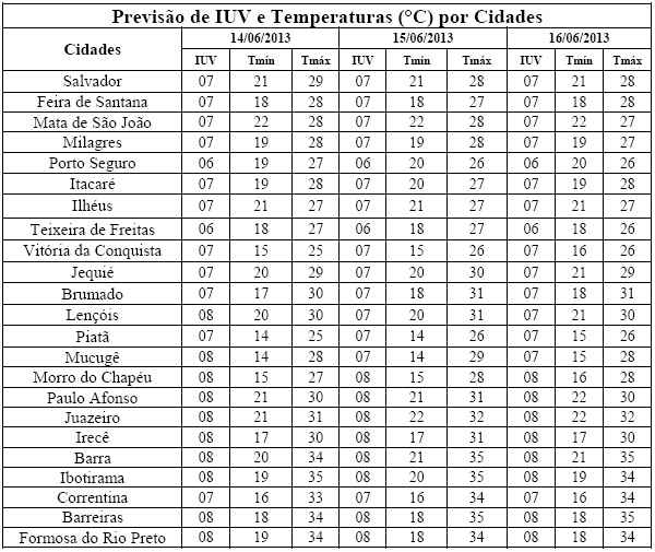 As estações do outono e inverno têm como característica a redução na incidência de radiação solar no Hemisfério Sul e, consequentemente, dos Índices de Radiação Ultravioleta (IUV's), como previsto para o período de 14/06 (sexta-feira) a 16/06 (domingo), quando os IUV's deverão variar de 06 a 08. Estes Índices fazem parte das categorias “Alta e Muito Alta”, segundo a Organização Mundial de Saúde (OMS). Os IUV's registrados durante as estações da primavera e verão podem chegar a categoria “Extrema” (com valor 14).