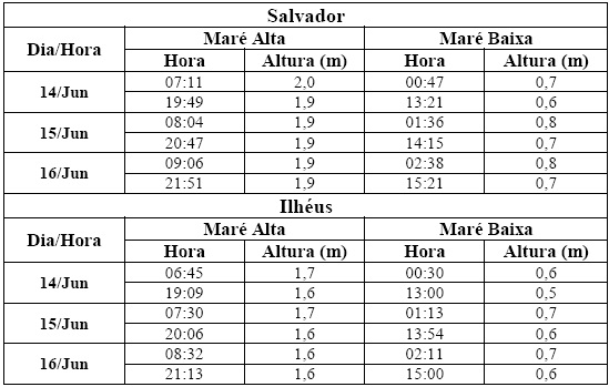Entre os dias 14/06 (sexta-feira) e 16/06 (domingo), a maré deverá atingir sua altura máxima em torno das 7h30 e das 19h30, com valores variando de 1,6 a 2 metros. Já a altura mínima deve ocorrer por volta de 1h30 e das 13h30, com valores variando de 0,5 a 0,8 metro. As ondas para este final de semana deverão ter agitação fraca, com altura máxima de 1,5 metro.