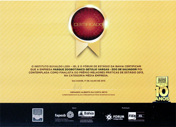 Finalista do Prêmio de Melhores Práticas de Estágio 2013, o Parque Zoobotânico Getúlio Vargas recebeu no último dia 17 de julho a premiação de segundo colocado da categoria média empresa, feita pelo Instituto Euvaldo Lodi – IEL e o Fórum de Estágio da Bahia. O Zoo de Salvador, que participou pela primeira vez do prêmio, ficou atrás somente da DESENBAHIA.