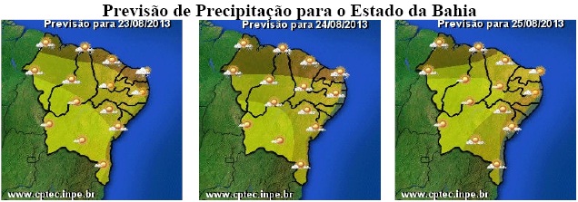 Na Bahia, mesmo com a redução da umidade, há previsão de chuvas fracas em toda a faixa centro-leste do Estado, sendo que as chances serão maiores nas regiões do Recôncavo, Nordeste e Sul. Já nas regiões da Chapada Diamantina e Sudoeste, essas chuvas deverão ocorrer em áreas isoladas e serão mais frequentes durante a noite. Também são nessas duas regiões onde são esperadas as menores temperaturas do Estado, com mínimas podendo chegar aos 13°C.