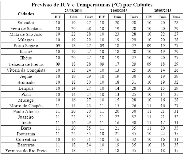 Uma das características da aproximação da primavera é a elevação na incidência de radiação solar no Hemisfério Sul e, consequentemente, dos Índices de Radiação Ultravioleta (IUV's). Esta elevação pode ser vista na previsão para o período de 23 a 25 (sexta-feira a domingo), quando os IUV's deverão variar de 09 a 11 que, segundo a Organização Mundial de Saúde (OMS) fazem parte das categorias de intensidade “Muito Alta e Extrema”. Com isso, requer cuidados quanto à exposição prolongada à radiação solar, principalmente, nos horários das 10 às 16h, como: o uso de protetor/filtro solar, chapéus, bonés, óculos escuros e roupas leves. Tais cuidados são necessários para minimizar danos à saúde, sobretudo a pele e aos olhos.