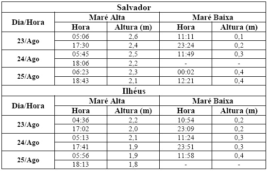 Entre os dias 23 (sexta-feira) e 25 (domingo), a maré deverá atingir sua altura máxima em torno das 06h00min e das 18h00min, com valores variando de 1,8 a 2,6 metros. Já as alturas mínimas deverão ocorrer por volta de 12h e das 24h, com valores variando de 0,1 a 0,4 metro. As ondas previstas para os próximos dias deverão ter agitação moderada a fraca, com altura máxima podendo chegar aos 2,0 metros.