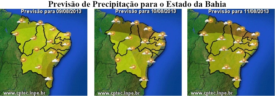 Nos próximos dias, as condições do tempo na faixa centro-leste da Bahia continuam sendo influenciadas pelos ventos úmidos que sopram do Oceano Atlântico. Com isso, prevalece a condição de céu nublado a parcialmente nublado com chuvas fracas, principalmente nas regiões do Recôncavo, Nordeste, Sul. Como é típico dessa época do ano, essas chuvas serão mais frequentes durante a noite e nas primeiras horas da manhã.
