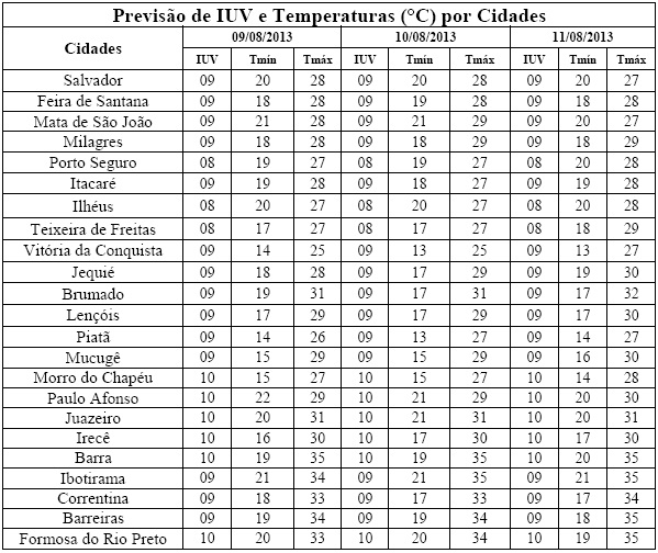 Só relembrando que uma das características da estação do inverno é a redução na incidência de radiação solar no Hemisfério Sul e, consequentemente, dos Índices de Radiação Ultravioleta (IUV's). Tal redução pode ser vista na previsão para o período de 09 a 11 (sexta-feira a domingo), quando os IUV's deverão variar de08 a10 que, segundo a Organização Mundial de Saúde (OMS) fazem parte da categoria de intensidade “Muito Alta”. Com isso, requer cuidados quanto à exposição prolongada à radiação solar, principalmente, nos horários das 10 às 16h, como: o uso de protetor/filtro solar, chapéus, bonés, óculos escuros e roupas leves. Tais cuidados são necessários para minimizar danos à saúde, sobretudo a pele e aos olhos.