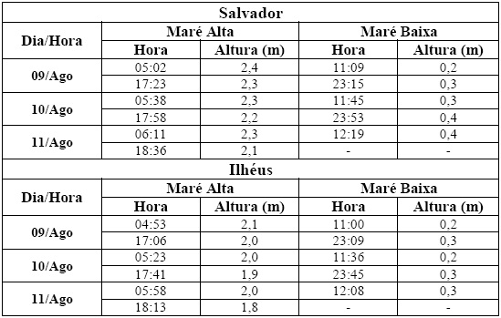 Entre os dias 09 (sexta-feira) e 11 (domingo), a maré deverá atingir sua altura máxima em torno das 06h e das 18h, com valores variando de 1,8 a 2,4 metros. Já as alturas mínimas deverão ocorrer por volta de 12h e das 24h, com valores variando de 0,2 a 0,4 metro. As ondas para este final de semana deverão ter agitação de moderada a fraca, com altura máxima podendo chegar a 2,0 metros.