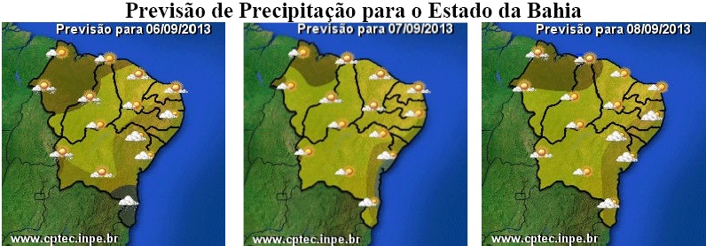 Durante o final de semana que se comemora a Independência do Brasil, as condições do tempo em grande parte da Bahia ainda serão influenciadas por uma massa de ar quente e seco, o que mantém o céu com poucas nuvens e sem chuvas, principalmente na faixa centro-oeste e norte do Estado. Além de inibir as chuvas, esse sistema meteorológico também está contribuindo para reduzir a umidade do ar a níveis considerados preocupantes, bem como, para a elevação nas temperaturas. Com isso, para as regiões Oeste, São Francisco e Norte, onde a massa de ar atua com mais intensidade, são esperados os menores índices de umidade (em torno de 30%) e os maiores de temperaturas (máximas de 36ºC) do Estado.