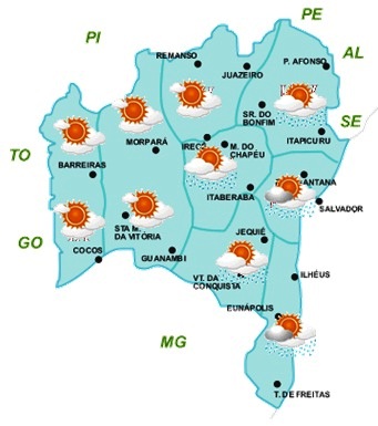 Por outro lado, uma frente fria que avança pelo litoral do Sudeste brasileiro é que deve influenciar o tempo na faixa centro-leste da Bahia, aumentando a nebulosidade e as chances de ocorrer chuvas nessa área do Estado. Com isso, a previsão para os próximos dias é de céu nublado a parcialmente nublado e com chuvas fracas nas regiões do Recôncavo, Nordeste, Chapada Diamantina, Sudoeste e Sul. É importante destacar que, além da influência desse sistema frontal, os ventos úmidos que vêm do Oceano Atlântico também deverão intensificar as chuvas, principalmente nas regiões do Recôncavo e Sul.