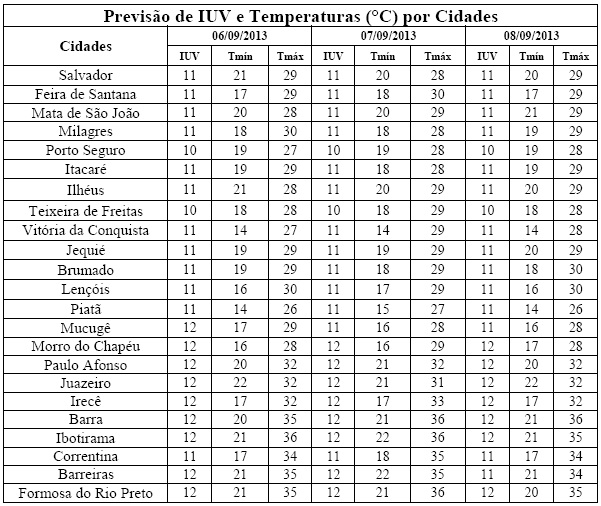 Uma das características da aproximação da primavera é a elevação na incidência de radiação solar no Hemisfério Sul e, consequentemente, dos Índices de Radiação Ultravioleta (IUV's). Esta elevação pode ser vista na previsão para o período de 06 a 08 (sexta-feira a domingo), quando os IUV's deverão variar de 10 a 12. Segundo a Organização Mundial de Saúde (OMS), esses Índices fazem parte das categorias de intensidade “Muito Alta e Extrema”, o que requer mais atenção quanto à exposição prolongada à radiação solar, principalmente, nos horários das 10 às 16h. Cuidados como: o uso de protetor/filtro solar, chapéus, bonés, óculos escuros e roupas leves são essenciais para minimizar danos à saúde, sobretudo a pele e aos olhos.