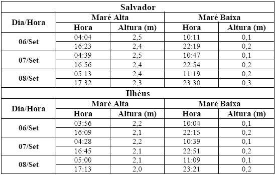 Entre os dias 06 (sexta-feira) e 08 (domingo), a maré deverá atingir sua altura máxima em torno de 04h30 e das 16h30, com valores variando de 2,0 a 2,5 metros. Já as alturas mínimas deverão ocorrer por volta de 10h30 e das 22h30, com valores variando de 0,1 a 0,3 metro. As ondas previstas para os próximos dias deverão ter agitação moderada a fraca, com altura máxima podendo chegar aos 2,0 metros.