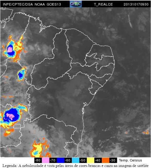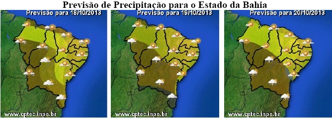 Para as regiões da Chapada Diamantina e Norte, onde a massa de ar quente e seco ainda influencia o tempo, embora com menor intensidade, o predomínio é de céu nublado a parcialmente nublado na maior parte do período. Nessas áreas, também há previsão de chuvas para os próximos dias, sendo que as maiores chances são para a região da Chapada Diamantina. Mesmo que sejam de fraca intensidade, essas chuvas serão de grande importância para minimizar o número de focos de queimadas na região.