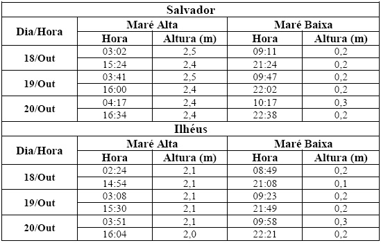 Entre os dias 18 (sexta-feira) e 20 (domingo), a maré deverá atingir sua altura máxima em torno das 04h e 16h, com valores variando de 2,0 a 2,5 metros. Já as alturas mínimas deverão ocorrer por volta de 10h e das 22h, com valores variando de 0,1 a 0,3 metro. As ondas previstas para os próximos dias deverão ter agitação fraca, com altura máxima podendo chegar a 1,5 metro.