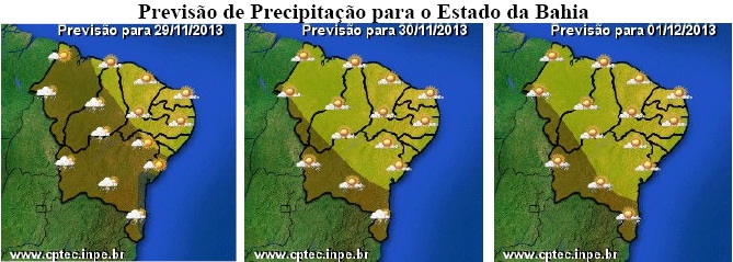 As condições do tempo na Bahia nesses últimos dias de novembro continuam sendo influenciadas, tanto pelo calor (que é típico dessa época do ano) quanto pela umidade que vem da região Amazônica. Com isso, se mantém a previsão de céu encoberto e chuvoso para grande parte do Estado, sendo esperadas as chuvas mais intensas nas regiões Oeste, São Francisco, Chapada Diamantina, Sudoeste e Sul.