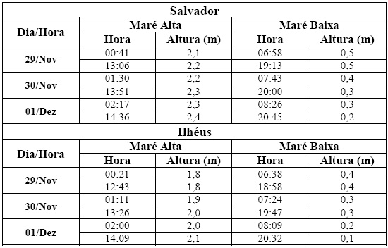 Entre os dias 29/11 (sexta-feira) e 01/12 (domingo), a maré deverá atingir sua altura máxima em torno de 1h30 e das 13h30, com valores variando de 1,8 a 2,4 metros. Já a altura mínima deverá ocorrer por volta de 7h30 e das 19h30, com valores variando de 0,1 a 0,5 metro. As ondas previstas para os próximos dias deverão ter agitação fraca, com altura máxima podendo chegar a 1,5 metro.
