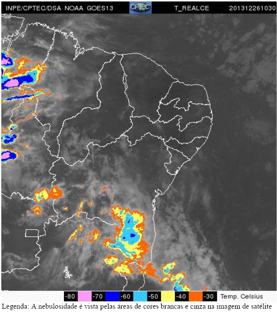 A tendência para o período de 30/12/13 (segunda-feira) a 01/01/14 (quarta-feira), que inclui o Réveillon 2014, é de redução da nebulosidade e de elevação nas temperaturas na maior parte do Estado. Essa previsão se deve atuação da massa de ar quente e seco que, nesse período ganha força, aumentando assim as chances de redução das chuvas, inclusive na noite da virada (31/12).