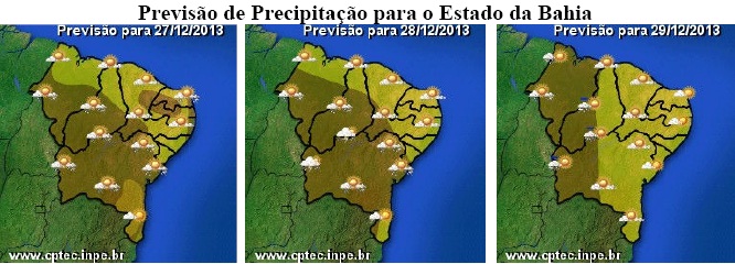 Para o período de 27/12 (sexta-feira) a 29/12 (domingo), último fim de semana de 2013, as condições do tempo na Bahia continuam sendo influenciadas pela umidade vinda da região Amazônica, mas também pelo calor típico dessa época do ano, o que deverá manter o céu encoberto e chuvoso na maior parte do Estado.