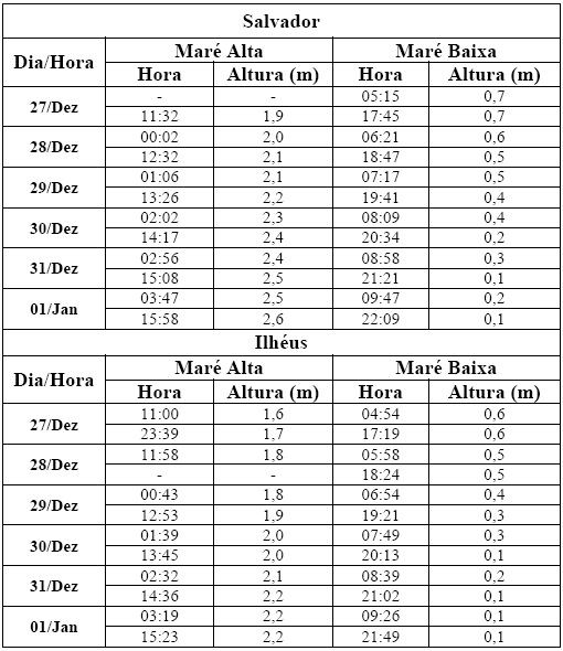 Entre os dias 27/12/13 (sexta-feira) e 01/01/14 (quarta-feira), a maré deverá atingir sua altura máxima entre a meia noite (0h) e às 3h e, entre as 12h e 15h, com valores variando de 1,6 a 2,6 metros. Já a altura mínima deverá ocorrer entre as 6h e às 9h e, entre as 18h e 21h, com valores variando de 0,1 a 0,7 metro. As ondas previstas para esse período deverão ter agitação fraca, com altura máxima podendo chegar a 1,5 metro.