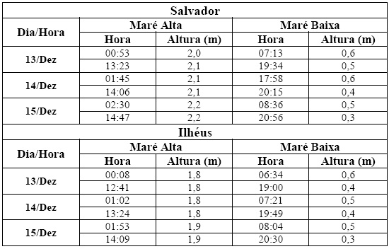 Entre os dias 13 (sexta-feira) e 15 (domingo), a maré deverá atingir sua altura máxima em torno de 01h30 e das 13h30, com valores variando de 1,8 a 2,2 metros. Já as alturas mínimas deverão ocorrer por volta de 07h30 e das 19h30, com valores variando de 0,3 a 0,6 metro. As ondas previstas para os próximos dias deverão ter agitação de moderada a fraca, com altura máxima podendo chegar a 2,0 metros.