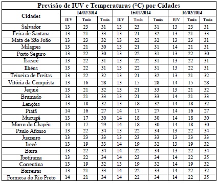 Uma das características da estação do verão é a elevação na incidência da radiação solar e, consequentemente, dos Índices de Radiação Ultravioleta (IUV's). Tal elevação pode ser vista na previsão dos IUV's para o período de 14/02/14 (sexta-feira) a 16/02/14 (domingo), quando deverão variar de 13 a 14. Segundo a Organização Mundial de Saúde (OMS), estes Índices estão classificados na categoria “Extrema”, o que requer cuidados quanto à exposição prolongada a radiação solar, principalmente, nos horários das 10 às 16 horas. Pois é nesse intervalo de tempo que os efeitos danosos à saúde são maiores. Assim, para minimizar tais danos durante a exposição a essa radiação, recomenda-se o uso de protetor/filtro solar, chapéus, bonés, óculos escuros e roupas leves.