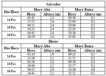 Entre os dias 14/02/14 (sexta-feira) e 16/02/14 (domingo), a maré deverá atingir sua altura máxima em torno das 4h e das 16h, com valores variando de 1,9 a 2,4 metros. Já a altura mínima deverá ocorrer em torno das 10h e das 22h, com valores variando de 0,1 a 0,8 metro. As ondas previstas para esse período deverão ter agitação fraca, com altura máxima podendo chegar a 1 metro.