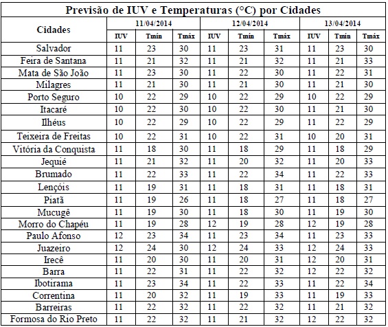 O outono é uma estação de transição entre o verão (com temperaturas elevadas e chuvas mais intensas e de curta duração) e o inverno (com temperaturas mais amenas e com chuvas de fraca intensidade, mas com maior durabilidade). Em ambas os Índices de Radiação Ultravioleta (IUV's) são elevados, como pode ser visto nesse início de outono, a exemplo da previsão para o período entre os dias 11/04 (sexta-feira) e 13/04 (domingo), quando deverão variar de 10 a 12. Segundo a Organização Mundial de Saúde (OMS), estes Índices estão classificados nas categorias “Muito Alto” e “Extremo”, o que requer cuidados quanto à exposição prolongada a radiação solar, principalmente, nos horários das 10 às 16 horas, pois é nesse intervalo de tempo que os efeitos danosos à saúde são maiores. Assim, para minimizar tais danos, recomenda-se o uso de protetor/filtro solar, chapéus, bonés, óculos escuros e roupas leves.