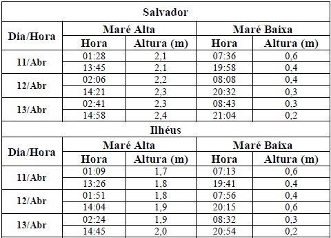 Entre os dias 11/04 (sexta-feira) e 13/04 (domingo), a maré deverá atingir sua altura máxima em torno das 2h e 14h, com valores variando de 1,7 a 2,4 metros. Já as altura mínima deverá ocorrer em torno das 8h e 20h, com valores variando de 0,2 a 0,6 metro. As ondas previstas para esse período deverão ter agitação fraca, com altura máxima podendo chegar a 1,5 metro.