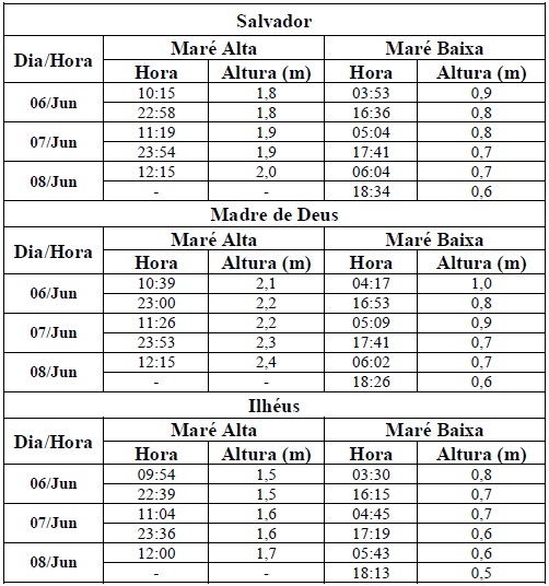 Entre os dias 06/06 (sexta-feira) e 08/06 (domingo), a maré deverá atingir sua altura máxima no período entre as 09h e as 12h e entre as 21h e às 24h, com valores variando de 1,5 e 2,4 metros. Já a altura mínima deverá ser registrada no período entre as 03h e as 06h e entre as 15h e às 18h, com valores variando de 0,1 a 1metro. As ondas previstas para esse período deverão ter agitação fraca, com altura máxima podendo chegar até 1 metro.