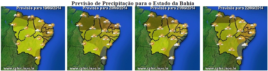 As condições do tempo na Bahia, previstas para o período de 19 a 22/06, continuam sendo influenciadas por sistemas meteorológicos de diferentes características. Um deles é uma massa de ar seco, que mesmo perdendo força, mantém o céu ensolarado e com poucas chances de ocorrer chuvas, principalmente, nas regiões Oeste, São Francisco e Norte.