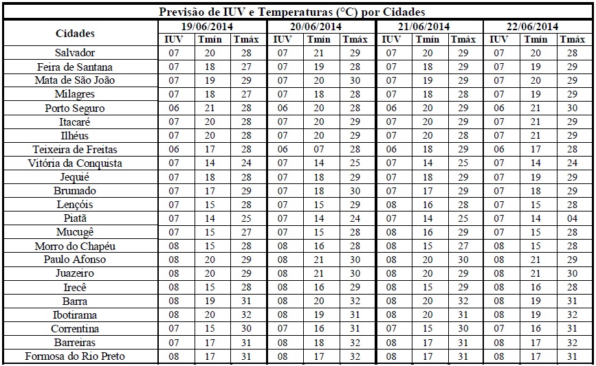 Uma das características do inverno já vem sendo percebida nos últimos dias, como, temperaturas mais amenas e chuvas de fraca intensidade, mas com maior durabilidade, além da redução nos Índices de Radiação Ultravioleta (IUV's). No entanto, a condição de céu com poucas nuvens, ainda mantém esses Índices elevados em algumas regiões, como aqueles que estão previstos para o período entre os dias 19/06 (quinta-feira) e 22/06 (domingo), quando deverão variar de 06 a 08. Segundo a Organização Mundial de Saúde (OMS) estes Índices estão classificados nas categorias “Alto” e “Muito Alto”, o que é recomendado o uso de protetor/filtro solar, chapéus, bonés, óculos escuros e roupas leves, principalmente, nos horários das 10 às 16 horas. Pois é nesse intervalo de tempo que os efeitos danosos à saúde são maiores.