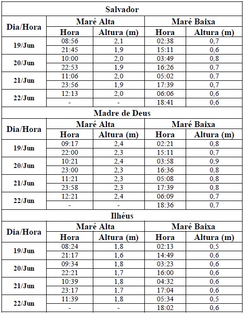 Entre os dias 19/06 (quinta-feira) e 22/06 (domingo), a maré deverá atingir sua altura máxima no período entre as 09h e as 12h e entre as 21h e às 24h, com valores variando de 1,6 e 2,4 metros. Já a altura mínima deverá ser registrada no período entre as 03h e às 06h e entre as 15h e às 18h, com valores variando de 0,5 a 0,9 metro. As ondas previstas para esse período deverão ter agitação de moderada a fraca, com altura máxima podendo chegar até 2 metros.