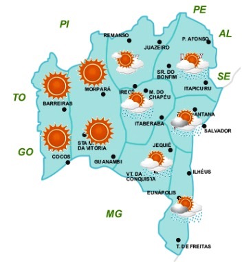 Nos próximos dias, não estão previstas mudanças significativas nas condições do tempo para a Bahia, ou seja, na faixa centro-oeste e norte continua predominando uma massa de ar seco, o que deverá manter o céu ensolarado e sem chuvas. Além de impedir a formação de nuvens, a permanência dessa massa de ar mantém, nessas áreas, as temperaturas mais elevadas do Estado (33°C), bem como, reduz os índices de umidade do ar a níveis relativamente baixos (40%).