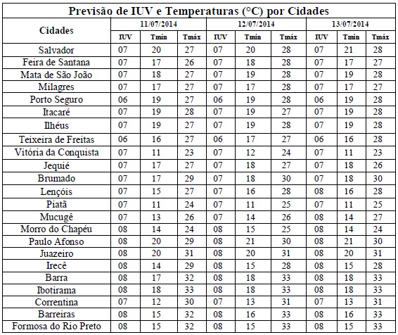 Uma das características da estação do inverno é a redução nos Índices de Radiação Ultravioleta (IUV's). No entanto, a condição de céu com poucas nuvens, ainda mantém esses Índices elevados em algumas regiões, como aqueles que estão previstos para o período entre os dias 11/07 (sexta-feira) e 13/07 (domingo), quando deverão variar de 06 a 08. Segundo a Organização Mundial de Saúde (OMS) estes Índices estão classificados nas categorias “Alto” e “Muito Alto”, o que é recomendado o uso de protetor/filtro solar, chapéus, bonés, óculos escuros e roupas leves, principalmente, nos horários das 10 às 16 horas. Pois é nesse intervalo de tempo que os efeitos danosos à saúde são maiores.