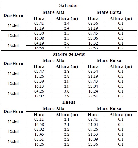 Entre os dias 11/07 (sexta-feira) e 13/07 (domingo), a maré deverá atingir sua altura máxima no período entre as 02h e as 05h e entre as 14h e às 17h, com valores variando de 2,1 e 3 metros. Já a altura mínima deverá ser registrada no período entre as 08h e às 11h e entre as 20h e às 23h, com valores variando de 0,1 a 0,2 metro. As ondas previstas para esse período deverão ter agitação fraca, com altura máxima podendo chegar a 1,5 metro.