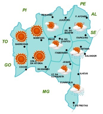As condições do tempo previstas para os próximos dias não deverão ter mudanças significativas em, praticamente, toda a Bahia, onde sistemas meteorológicos de diferentes características continuam predominando em áreas distintas.