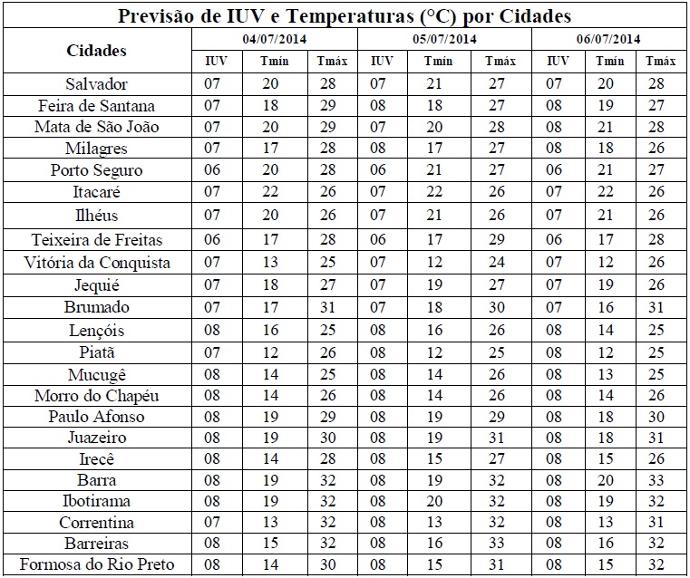 Uma das características da estação do inverno é a redução nos Índices de Radiação Ultravioleta (IUV's). No entanto, a condição de céu com poucas nuvens, ainda mantém esses Índices elevados em algumas regiões, como aqueles que estão previstos para o período entre os dias 04/07 (sexta-feira) e 06/07 (domingo), quando deverão variar de 06 a 08. Segundo a Organização Mundial de Saúde (OMS) estes Índices estão classificados nas categorias “Alto” e “Muito Alto”, o que é recomendado o uso de protetor/filtro solar, chapéus, bonés, óculos escuros e roupas leves, principalmente, nos horários das 10 às 16 horas. Pois é nesse intervalo de tempo que os efeitos danosos à saúde são maiores.