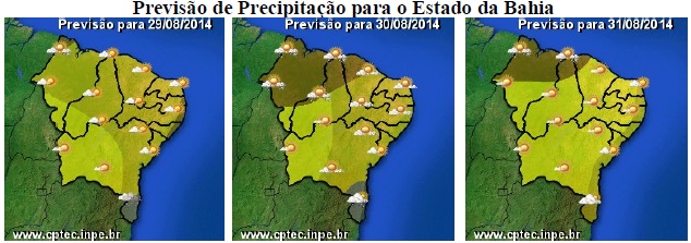 Por outro lado, nas regiões do Recôncavo, Nordeste e Sul, quem permanece influenciando o tempo são os ventos úmidos vindos do Oceano Atlântico, o que deverão manter o céu nublado a parcialmente nublado com chuvas fracas. Vale ressaltar que, as maiores chances destas chuvas são para as localidades mais próximas ao litoral. Outro sistema que deverá influenciar o tempo é uma frente fria que, com sua passagem em direção ao Oceano Atlântico, poderá trazer chuvas mais expressivas no extremo sul do Estado.