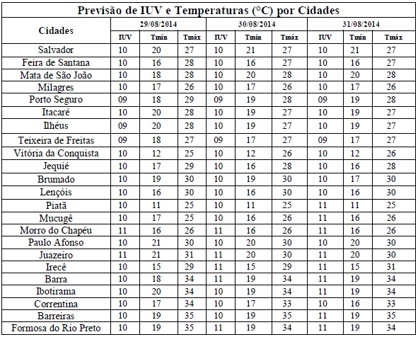 O inverno é a estação em que apresenta uma redução nos Índices de Radiação Ultravioleta (IUV's). Porém, a condição de pouca nebulosidade mantém esses Índices elevados em algumas regiões, como os que estão previstos para o período entre os dias 29/08 (sexta-feira) e 31/08 (sábado), quando deverão variar de 09 a 11. Segundo a Organização Mundial de Saúde (OMS) estes Índices estão classificados, respectivamente, nas categorias “Muito Alto” e “Extrema”, o que é recomendado o uso de protetor/filtro solar, chapéus, bonés, óculos escuros e roupas leves, principalmente, nos horários das 10 às 16 horas. Pois é nesse intervalo de tempo que os efeitos danosos à saúde são maiores.