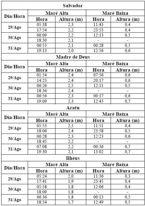 Entre os dias 29/08 (sexta-feira) e 31/08 (domingo), a maré deverá atingir sua altura máxima no período entre 05h e 07hn e entre as 17h e às 19h, com valores variando de 1,7 a 2,5 metros. Já a altura mínima deverá ser registrada no período entre as 11h e às 13h e entre 23h e 01h, com valores variando de 0,3 a 0,7 metro. As ondas previstas para esse período deverão ter agitação fraca, com altura máxima podendo chegar a 1,5 metro.